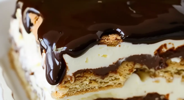 At its core, this dessert combines layers of chewy chocolate graham crackers with a lusciously smooth, pudding-like vanilla custard filling. It’s basically an elevated take on a classic icebox cake, but with the addition of a glossy chocolate topping that evokes the best eclairs or cream-filled doughnuts.