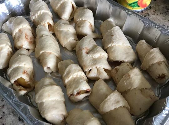 - Place one or two peach slices (depending on size) at the wide end of the dough triangle. Sprinkle with a pinch of cinnamon and roll dough around peach.