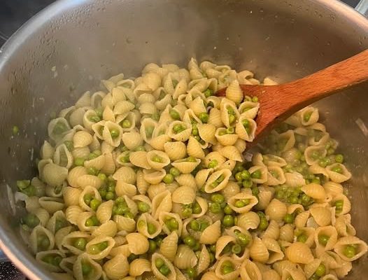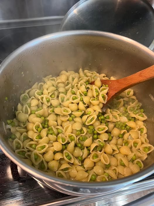 Baby shell pasta – little cups that perfectly cradle the peas and sauce, ensuring every bite holds both comfort and flavor.