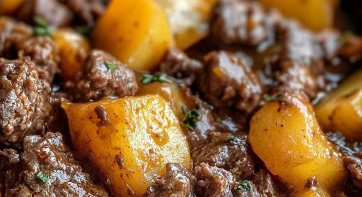The best thing about this recipe is that everything cooks together in the slow cooker, merging into a wonderfully cozy and satisfying meal. Just brown the beef, chop some onions and garlic, layer in sliced potatoes, and let it simmer away. In just 6-7 hours, dinner is ready!