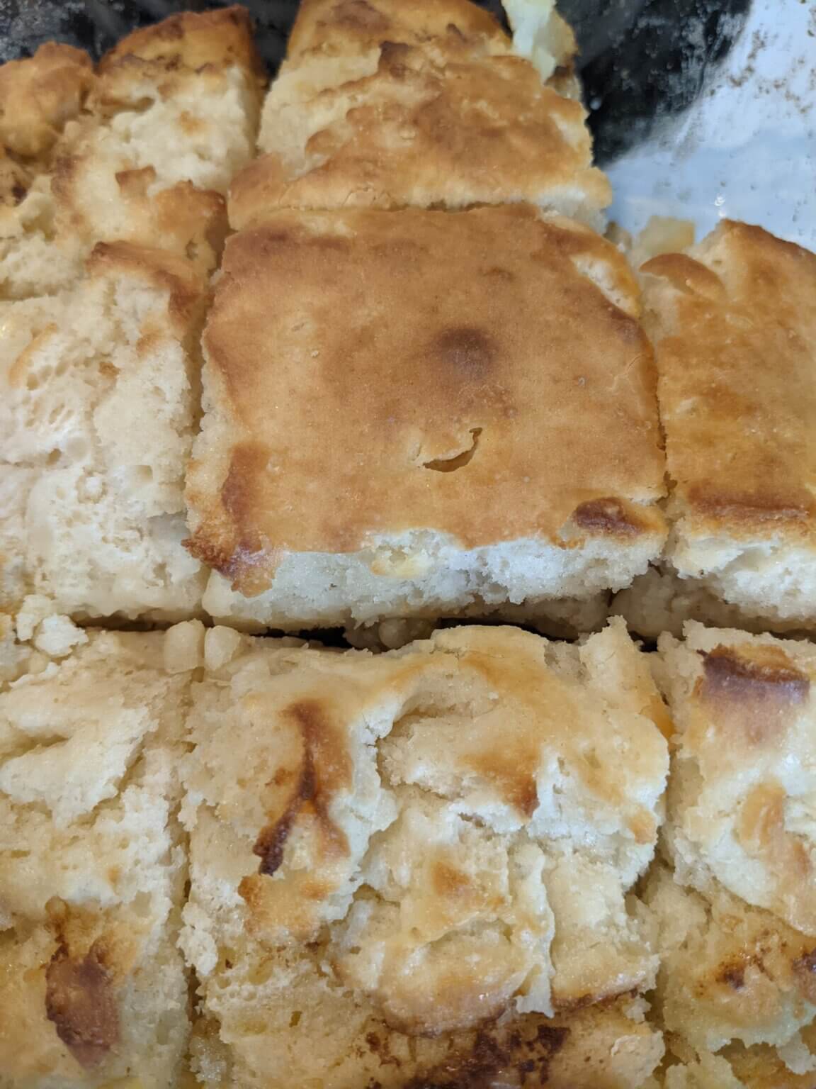 - Gently pour your biscuit mixture over that melted butter in the dish. To get those perfect portions, use a bench scraper (or a trusty old knife) and mark out 9 squares.