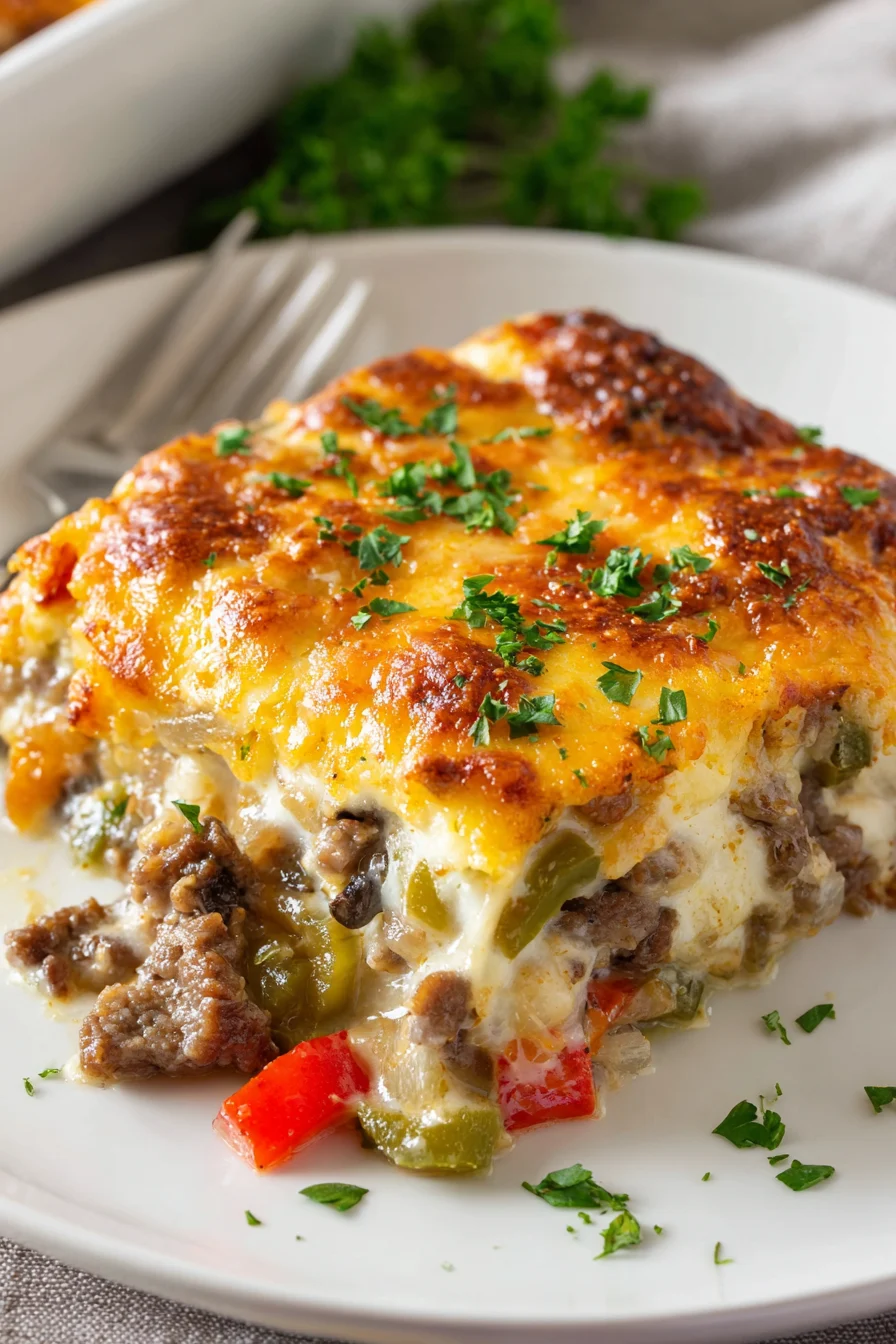 This Philly Cheesesteak Casserole is a hearty twist on the classic sandwich—tender beef, sautéed peppers and onions, and plenty of melted cheese baked together in a comforting casserole. An easy, family-friendly dinner full of flavor!
