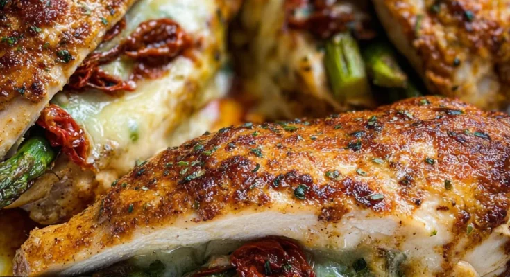 Easy to make chicken recipe stuffed with asparagus, cheese, and sun-dried tomatoes.