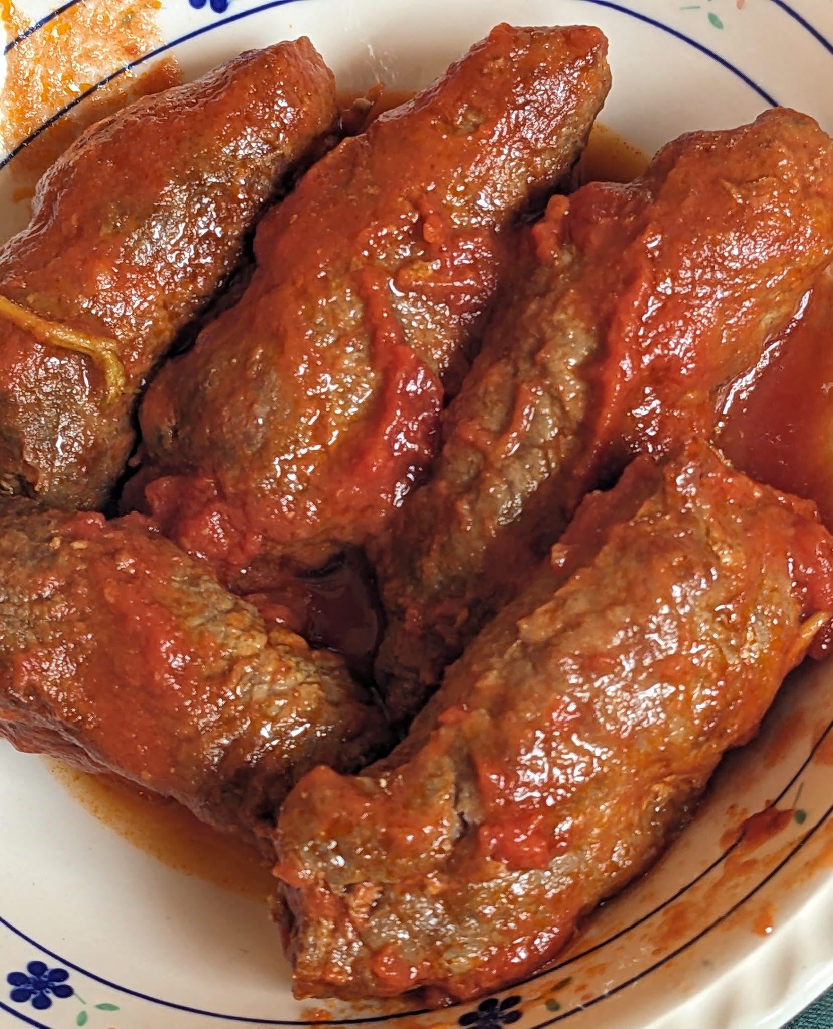 The beef should be fork-tender but not falling apart. After simmering for about 2 hours on low heat, test one roll — if it cuts easily and the interior is juicy and flavorful, it’s ready. The sauce should also be thickened and rich in color.