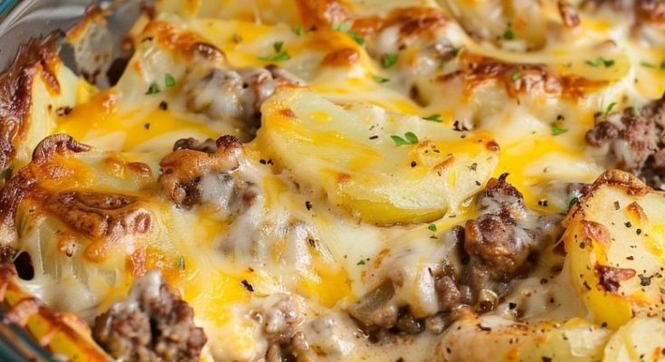 This Hamburger and Potato Casserole is a hearty, layered comfort food dish. It features savory ground beef and onions nestled between layers of tender sliced potatoes and a rich, creamy sauce, all topped with melted cheddar cheese.