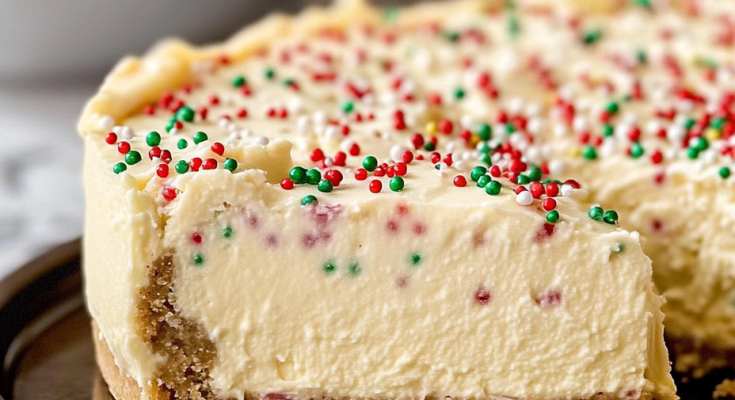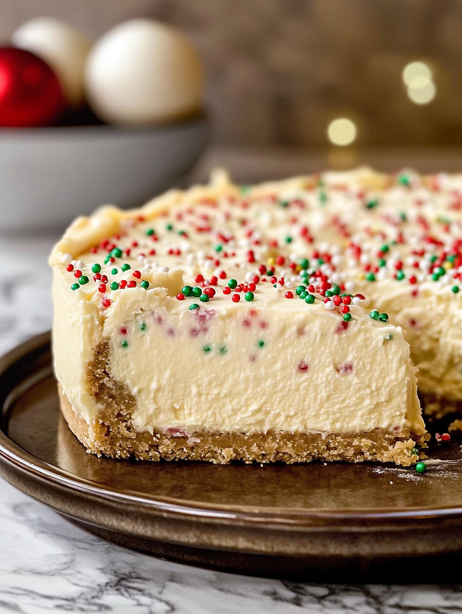 A luxurious holiday dessert combining buttery sugar cookies with creamy cheesecake, studded with edible cookie dough pieces and topped with white chocolate.