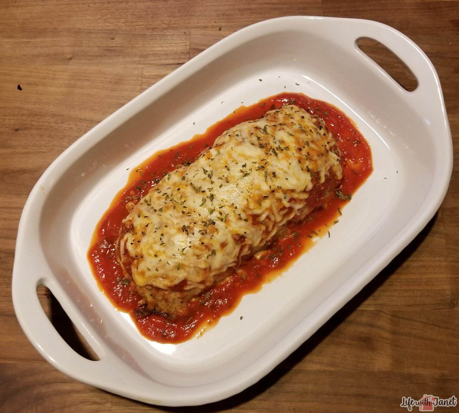 Next, I formed the meat mixture into a loaf and placed it into a loaf pan. I then topped the meatloaf with marinara sauce and baked it in the oven for 50 minutes. After 50 minutes, I removed the meatloaf from the oven and topped it with shredded mozzarella cheese. I returned it to the oven for an additional 10 minutes to allow the cheese to melt and become golden brown.