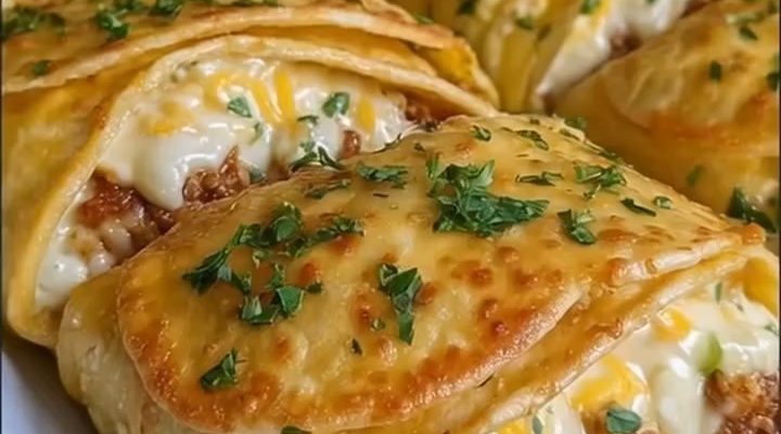 Fill the Dough: Spoon a portion of the beef mixture. Onto the wide end of each triangle. Then sprinkle some shredded cheddar cheese on top.
