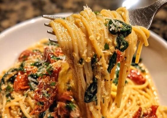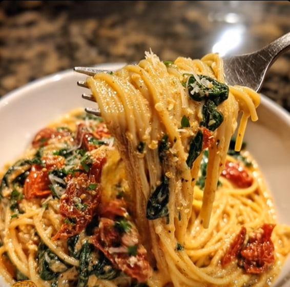 Each bite offers a symphony of contrasts — the sweetness of sun-dried tomatoes, the gentle bite of garlic, the silkiness of cream, and the freshness of spinach all entwined around tender strands of spaghetti. It’s a dish that feels both cozy and elegant — one that speaks of warmth, slow evenings, and the quiet pleasure of good food shared in good company.