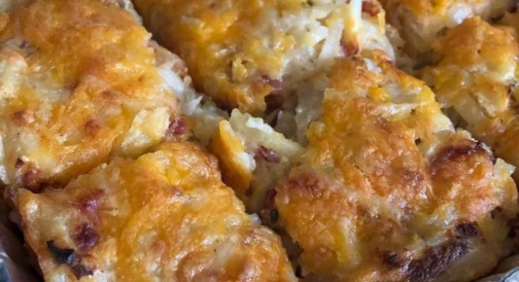 Mix hash browns and cheese sauce in a large bowl and spread the mixture in the prepared casserole dish. Make sure it’s all spread evenly throughout.