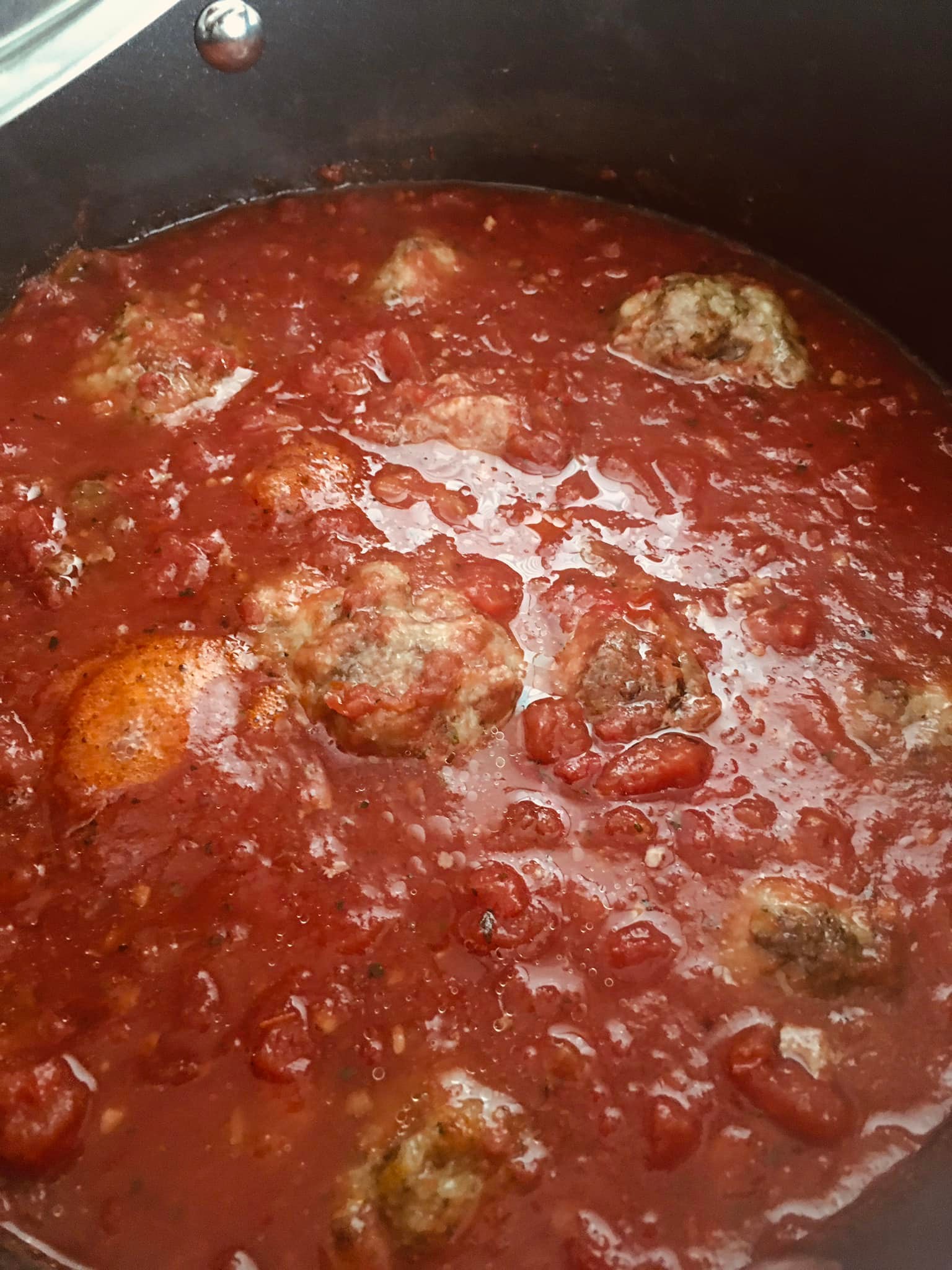 While the meatballs bake, prepare or heat your tomato sauce in a large pot over medium-low heat.