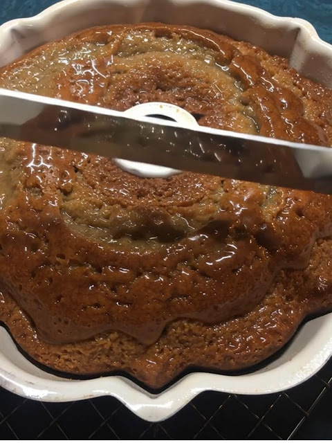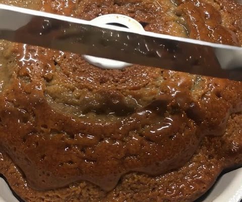 1. While the cake is still warm, drizzle the caramel sauce evenly over the top.