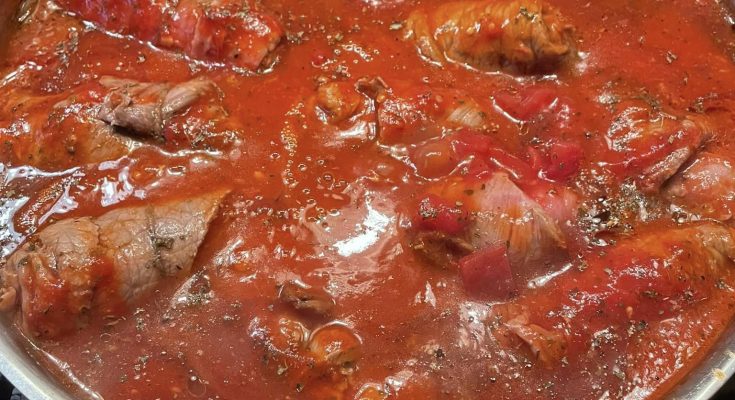 Thin slices of beef are transformed into delicate rolls, filled with garlic, Romano cheese, and fresh parsley, then wrapped in savory prosciutto for depth and richness. Simmered gently in a robust red wine and tomato sauce, the meat becomes fork-tender, absorbing every layer of flavor from the herbs and sauce.