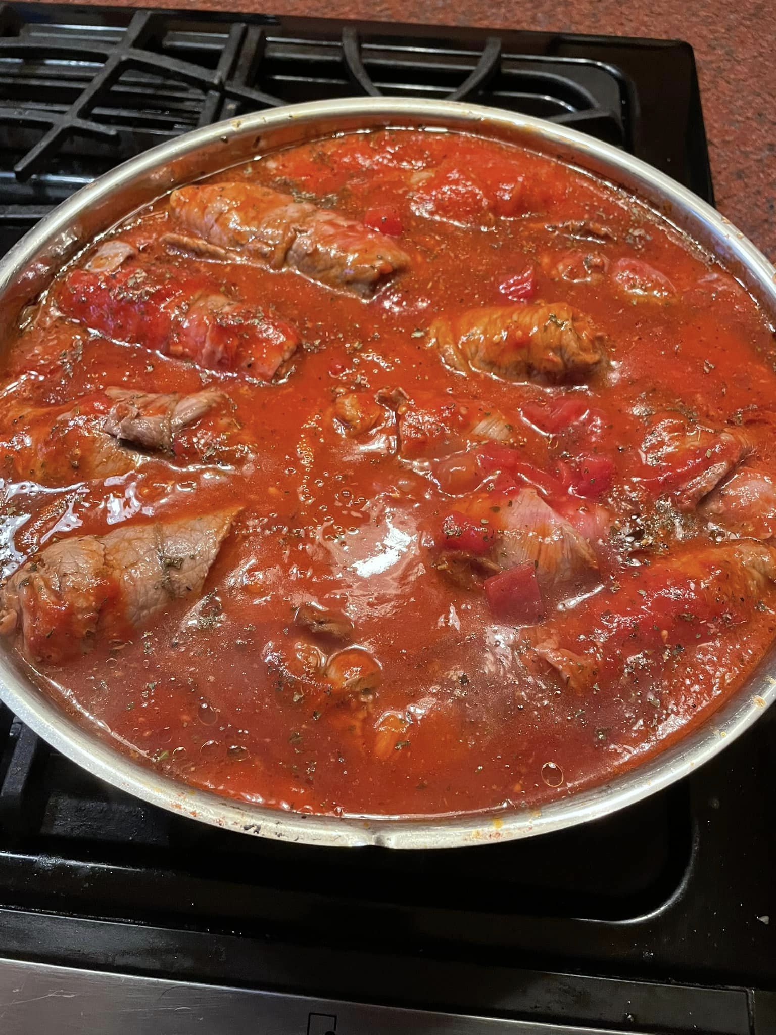 Cover and let it simmer for 2 hours, turning the braciole occasionally. If the sauce becomes too thick, add a bit of water.
