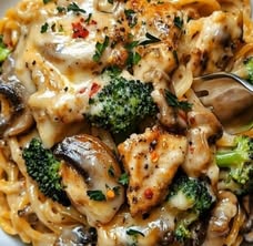 Tender strips of golden-seared chicken mingle with caramelized broccoli and garlicky mushrooms, all wrapped in a silky blanket of cheese-laced cream sauce that clings to each strand of linguine.